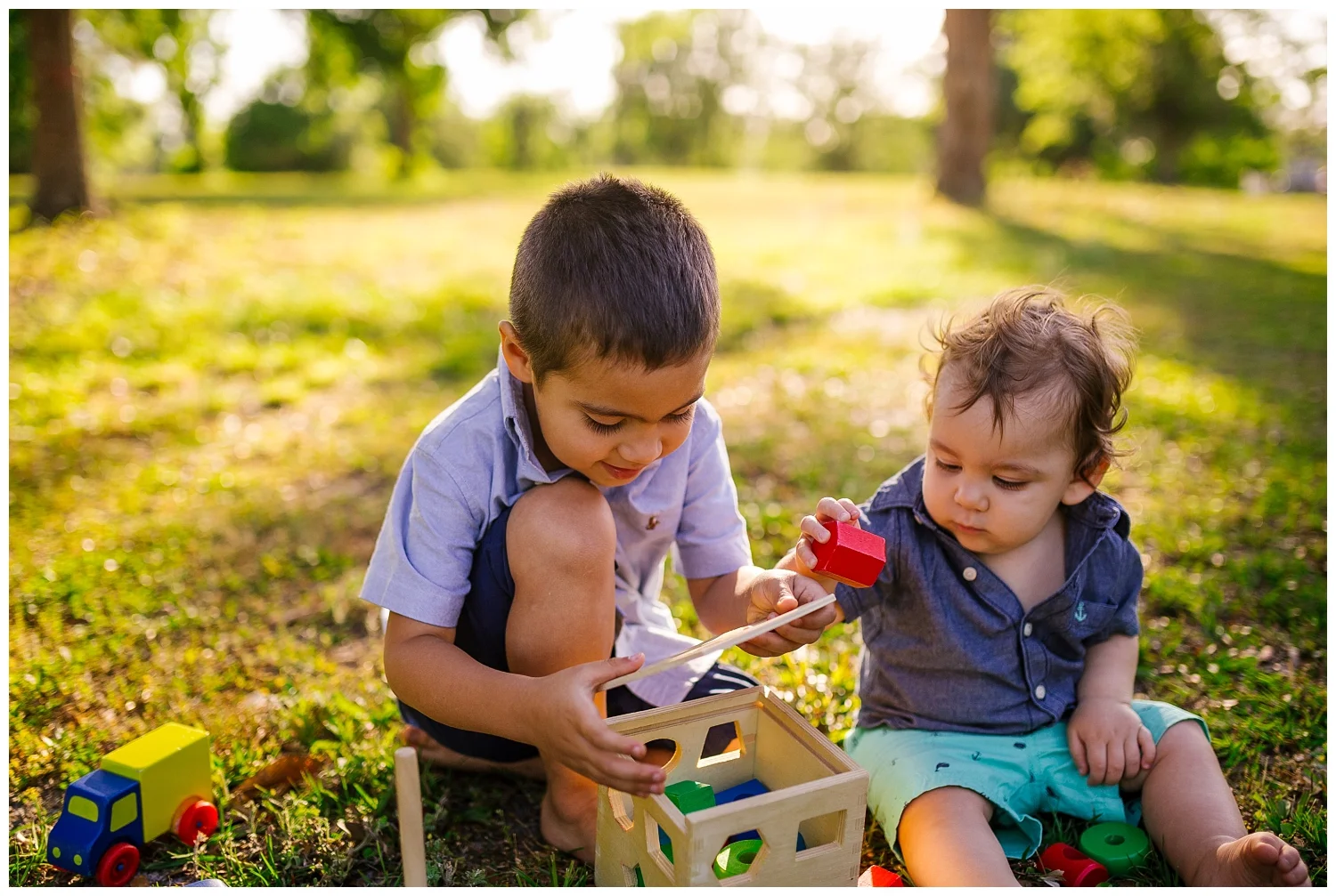 This was such a sweet outdoor family session. We loved capturing these sweet little boys with each other and their parents. We met in a beautiful outdoor field with lush greenery all around. We brought some toys for the brothers to play with and they had a great time tinkering with the blocks and making the cars go fast. Cristopher was a great big brother, helping Judah with the toys and blowing bubbles for him. The family was celebrating Judah turning one.